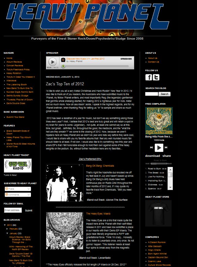 From Heavy Planet: 2012 has been a leviathan of a year for music, but don’t we say something along those lines every year? Well, I believe that 2012’s best are truly great and will retain a spot in my brain for years to come. Legendary… not quite, at least one cannot say so at this time, but great… definitely. So, throughout the good, the mediocre, and the “what the hell are they smokin’?” we come to the closing of 2012. Now, because we aren’t hipsters here at Heavy Planet and we didn’t do year-end lists way before they were cool, I would like to share with you my favorite albums that I feel any well rounded music fan should listen to at least, if not own. I would also like to try something new this year and share EP’s that I felt honorable enough to hold their own against some of the heavy weights on the podium. So, without further hesitation click HERE for my favorites!