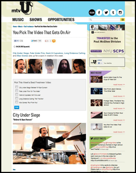 We’re stoked to report that Buffalo, NY, pop-rockers, City Under Siege, are competing on mtvU’s The Freshmen this week for a spot in regular rotation on mtvU!  This message is a call to arms for all fans of City Under Siege to follow the link below and vote as many times as you possibly can to secure this huge opportunity for this kick ass band.
