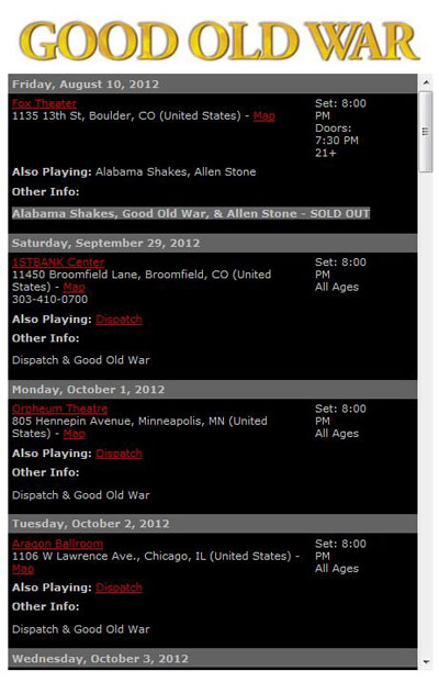 August 8, 2012Cherished HIP clients, Good Old War are on the road again taking their incredibly beautiful songs straight to the people. Amongst the cities they’ll be hitting are Chicago, Minneapolis, Boulder, and a lot more. Now’s your chance you catch em live, music lovers. Buy tix! Click here for info on these shows!