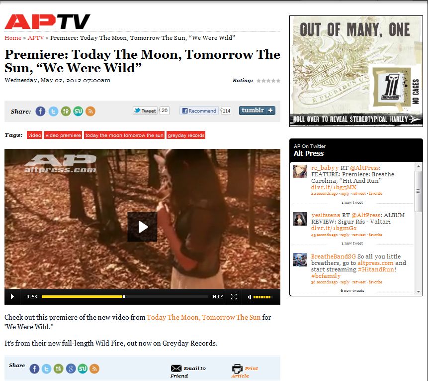 May 21, 2012Click here and head over to AltPress.com to check out the premiere of the new video, “We Were Wild,” from Today The Moon, Tomorrow The Sun off their new full-length Wild Fire, out now on Greyday Records.