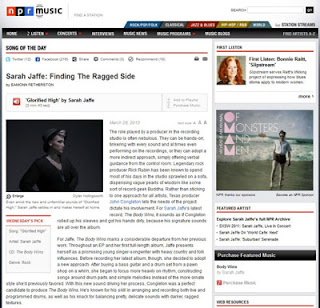 April 10, 2012We’re so psyched that the extremely talented and deserving, Sarah Jaffe has caught the eyes and ears of the good folks over at NPR Music. Check out an excerpt from her feature below!