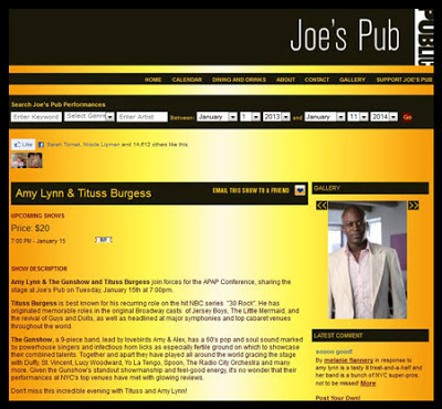 January 10, 2013Heads up NY-based Amy Lynn & The Gunshow fans: The 60’s blues and pop inspired powerhouse that you know and love is set to perform at beloved NYC venue, Joe’s Pub, next week and we highly recommend you catch this performance. They’re well known for bringing down the house at Joe’s Pub, so don’t sleep on this. Get your tickets HERE!